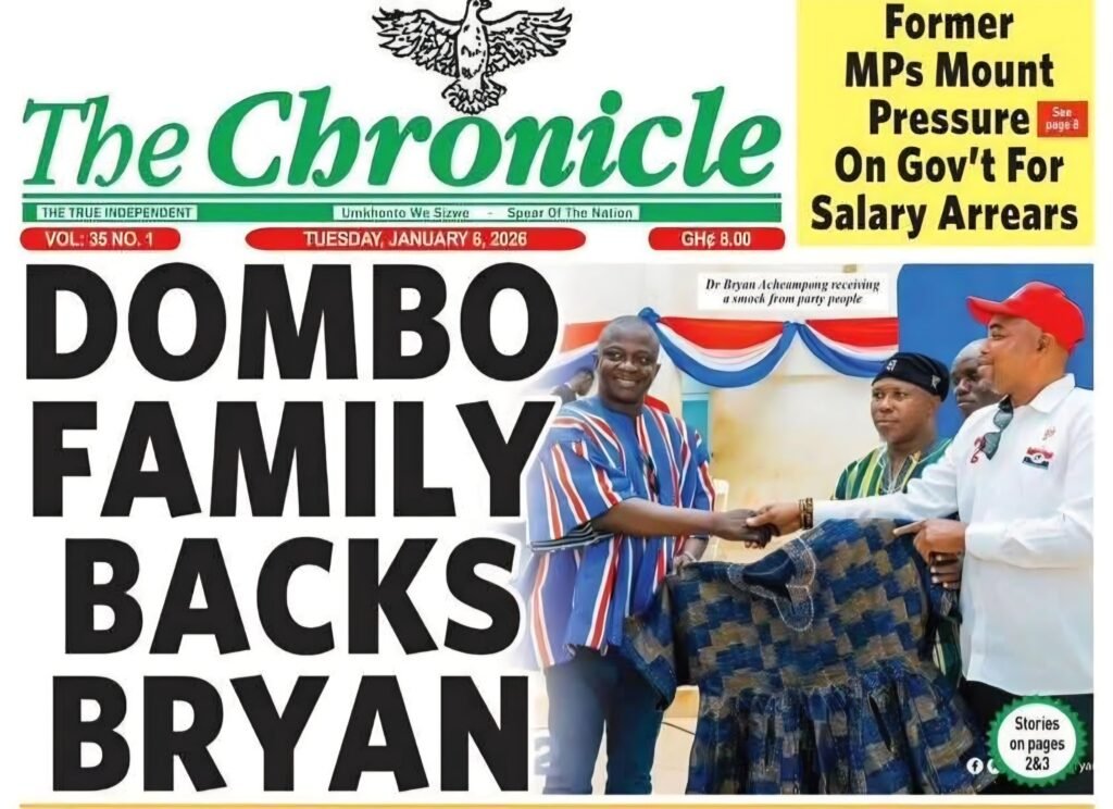 The publication, headlined “Dombo Family Backs Bryan,” carried a photograph showing Mr Abdul-Hamid together with the Wa Central Constituency Organiser, Daubile Alhassan Ibrahim, and Mohammed Abdul Safiu, Deputy Nasara Coordinator, presenting a smock to Dr. Acheampong.